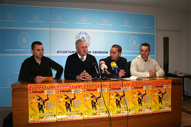 El alcalde de Cehegín, José Soria, el concejal de Deportes, Antonio Marín, el presidente del Club Good Times FMX, José Ortuño, y el campeón murciano Nicolás Ortuño han presentado el I Motocross Freestyle Internacional, que tendrá lugar el sábado 4 de abril a las 21 horas, en la Plaza de Toros de la localidad.