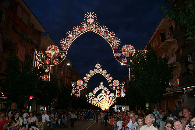 El Tío la Pita, los Gigantes y Cabezudos, la charanga Los Bigardos y numeroso público ha llenado las calles para asistir al encendido del alumbrado especial de fiestas, y a la apertura del Recinto Ferial, que este año marca un nuevo récord con 162 barracas.