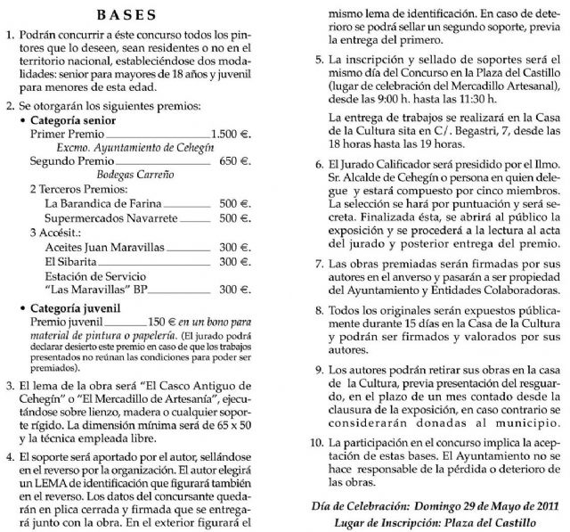 La próxima edición del Mercadillo Artesanal 'El Mesoncico', que se celebrará el domingo 29 de mayo, acogerá el décimo aniversario del Concurso de Pintura al Aire Libre 'Casco Antiguo de Cehegín', que repartirá más de 4.000 euros en premios.