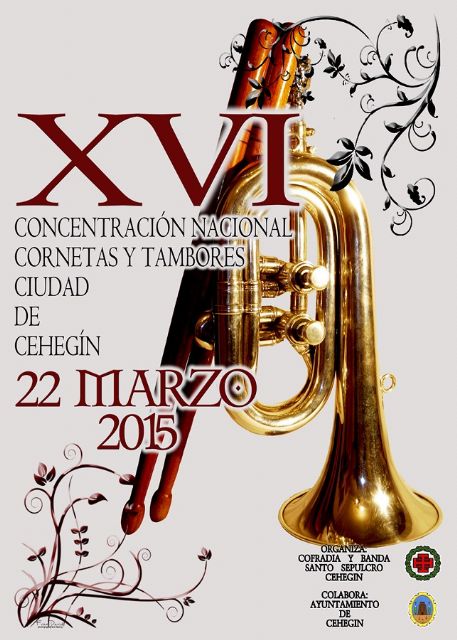 La Concentración Nacional de Bandas de Cornetas y Tambores 'Ciudad de Cehegín', organizada por la Cofradía del Santo Sepulcro, cumplirá 16 años el próximo 22 de marzo, Domingo de Pasión. Este año las formaciones invitadas son las bandas de Cornetas y Tambores Angustias de Porcuna (Jaén), la de Nuestra Señora de los Dolores de Puerto de la Torre (Málaga) y la de los Sayones de Pozoblanco (Córdoba) junto a las bandas anfitrionas, la infantil y la sénior del Santo Sepulcro.