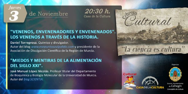 El próximo jueves, día 3 de noviembre, comenzará el ciclo de conferencias "Cehegín Cultural", organizado por la Concejalía de Cultura, dirigida por Maravillas Fernández, dedicado en esta edición al mundo de la ciencia, que llevará por título "La ciencia es cultura". Será en la Casa de la Cultura a las 20:30 horas y es una actividad del Pasaporte Cultural.