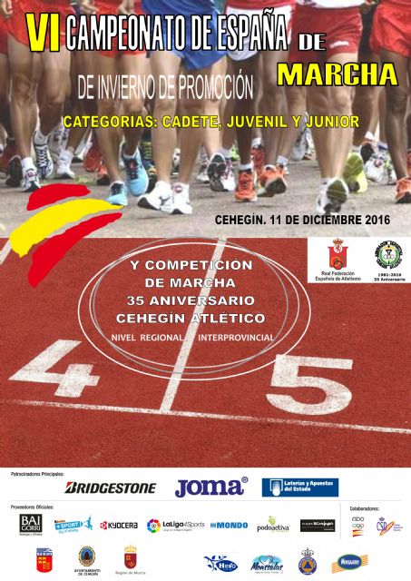 Esta prueba, que cuenta con la colaboración del Ayuntamiento de Cehegín, a través de su Concejalía de Deportes, y que organiza la delegación de la RFEA y la Federación Murciana de Atletismo, forma parte de los actos que el Club Cehegín Atlético está preparando para la celebración de sus treinta y cinco años de historia. Según han explicado los organizadores, está prevista la asistencia a Cehegín de unos 300 marchadores.