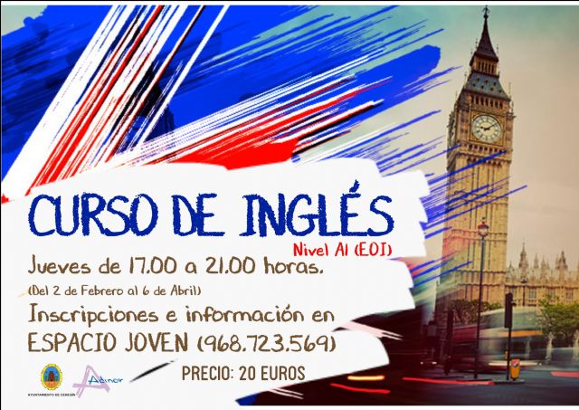 La Concejalía de Juventud del Ayuntamiento de Cehegín, dirigida por Maravillas Fernández, oferta un curso de inglés nivel A1 de la Escuela Oficial de Idiomas y que será impartido por la asociación Adinor.