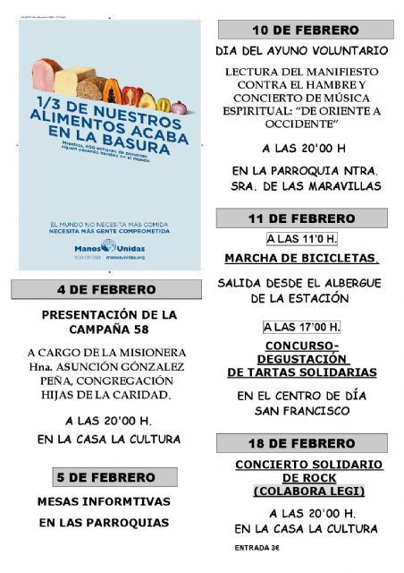 La Concejala de Servicios Sociales, Antonia Fernández, ha informado de que el colectivo de Manos Unidas ha preparado su campaña anual bajo el lema "El mundo no necesita más comida, necesita más gente comprometida" y comenzará el próximo sábado, 4 de febrero.