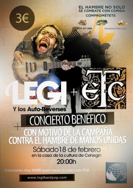 Según ha informado Antonia Fernández, Concejala de Servicios Sociales, Manos Unidas de Cehegín pondrá fin a sus actividades anuales contra el hambre, denominadas "El mundo no necesita más comida, necesita más gente comprometida", con un concierto de música hardpop a cargo del músico y cantante Legi. El concierto será el próximo sábado, 18 de febrero, a las 20:00 horas en la Casa de la Cultura de Cehegín.