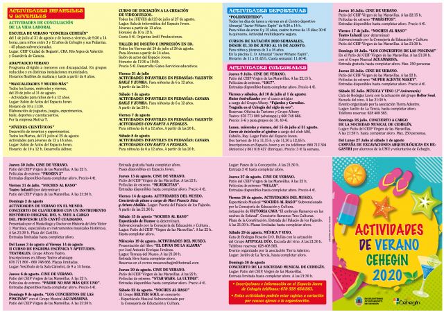 El Ayuntamiento de Cehegín, a través de sus concejalías de Cultura, Juventud, Deportes, Política Social y Turismo, ha hecho pública la programación de actividades para el verano. En ella habrá cine, teatro, conciertos y diferentes actividades infantiles y juveniles, deportivas, escuelas de verano, etc; todas ellas adaptadas a las medidas de seguridad del momento, respetando los aforos de cada espacio.