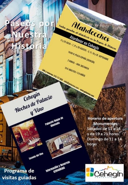 “Paseos por nuestra historia”, es una apuesta turística que se compone de “Atardeceres”, visitas guiadas al atardecer en Cehegín, y que tendrán lugar el 25 de julio; 7, 21 y 29 de agosto; y 5,11,19 y 25 de septiembre. Todas ellas darán comienzo a las 19:00 horas en la Plaza de España, su duración será de dos horas y 6 kilómetros de distancia. El precio de las mismas es de 10 euros para adultos y 5 euros para niños. Información y reservas en el 616717888 o info@guiasmur.com.