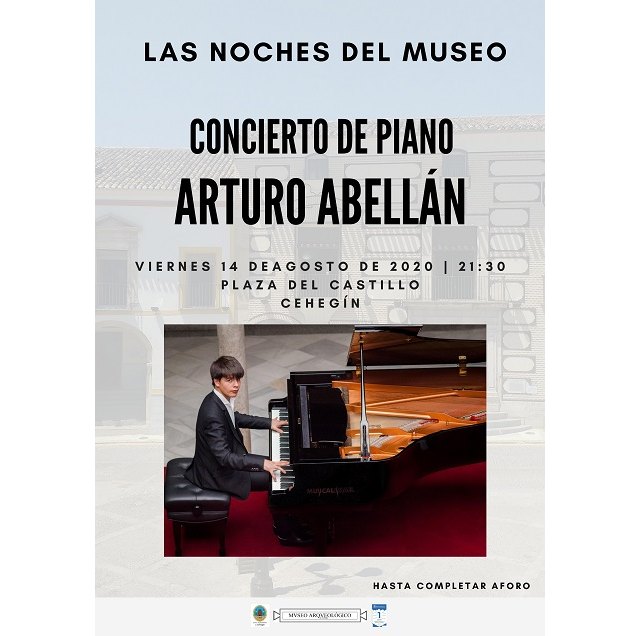 El joven y virtuoso pianista, Arturo Abellán Sánchez, ofrecerá este próximo viernes, 14 de agosto, un concierto de piano en la Plaza del Castillo de Cehegín, dentro de las “Noches del Museo”, actividades que se vienen desarrollando a lo largo de este mes de agosto. Están organizadas desde la concejalía de Cultura, que dirige Juan Martínez.  Será a las 21:30 horas hasta completar aforo.