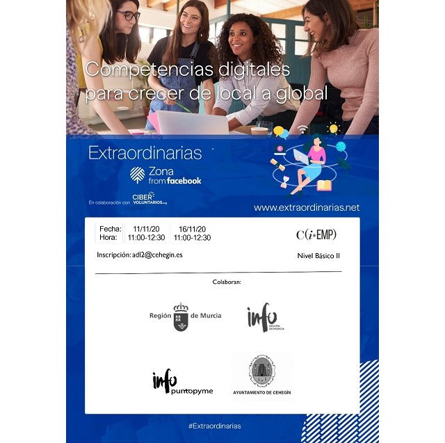La concejalía de Mujer e Igualdad, que dirige Mónica Sánchez, informa de que el Ayuntamiento acogerá el taller “Competencias digitales para crecer de local a global”, (Nivel Básico) dirigido a mujeres emprendedoras, dentro del  Programa de Formación Gratuita Extraordinarias, en colaboración con la Fundación Cibervoluntarios.