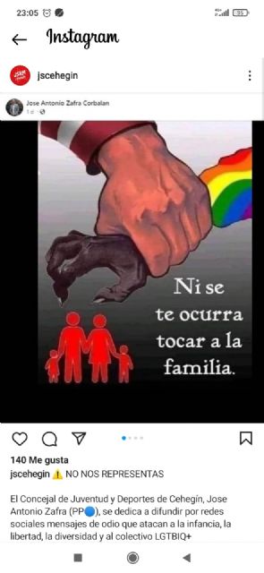 ASFAGALEM celebra que el Excmo. Sr. Fiscal Superior, les comunicara ayer 18 de octubre que se haya incoado las diligencias de investigación penal sobre unas publicaciones de tinte LGTBIfóbicos hechas en sus redes por el Concejal del PP de Cehegín Jose Antonio Zafra Corbalán, el pasado 26 de septiembre.