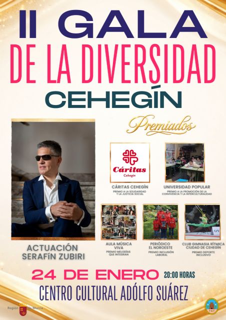 El Ayuntamiento de Cehegín, a través de la Concejalía de Política Social, que dirige Ana Plasencia, organiza la II Gala de la Diversidad, un acto que tiene como objetivo reconocer la labor de quienes trabajan por una sociedad más inclusiva, justa y cohesionada. La gala se celebrará el sábado 24 de enero a las 20:00 horas en el Centro Cultural “Adolfo Suárez”. El evento cuenta con la colaboración de la Dirección General de Servicios Sociales, Tercer Sector y Gestión de la Diversidad de la Región de Murcia.
